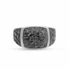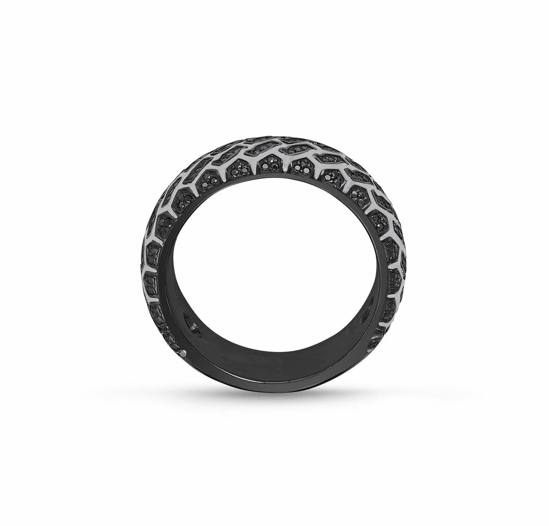 Crafted in 925 Sterling Silver, this edgy band ring features a tire tread pattern studded with 100% genuine and conflict free black diamonds. This ring is plated in black rhodium to give a dark grey glimmering finish. 1/3 carats of black diamonds are used in a pave setting.