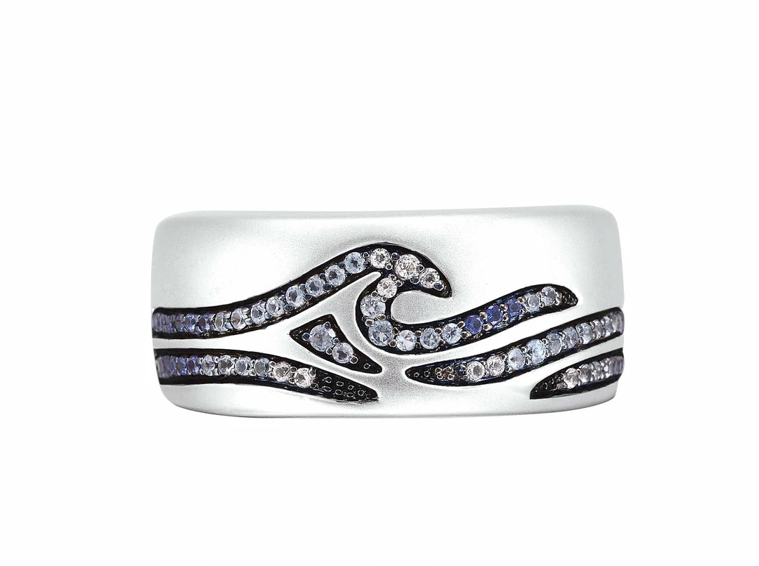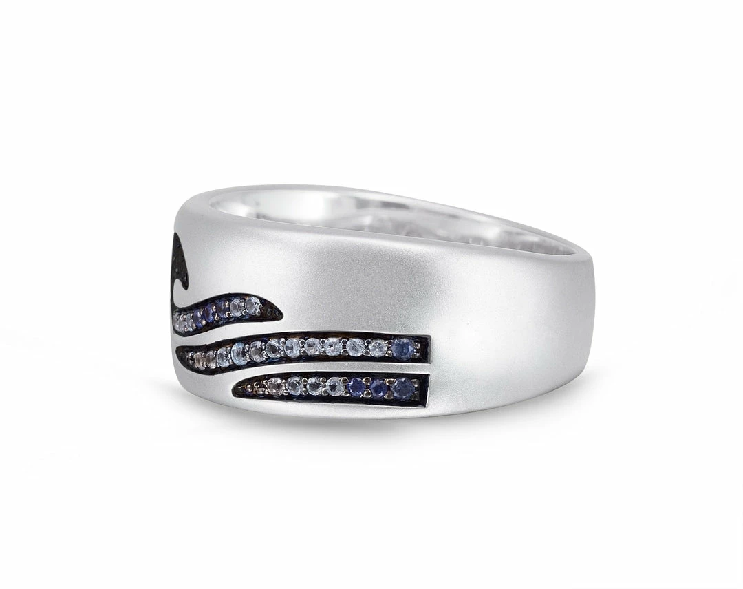 Crafted in 925 Sterling Silver, this sleek band ring features breaking ocean wave motifs studded with blue sapphire, baby swiss blue topaz and white topaz stones in a pre pave setting.