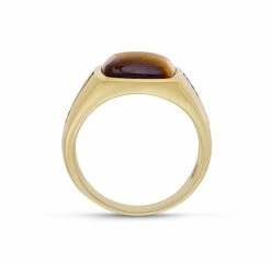 Crafted in 925 Sterling Silver, this tasteful ring features a chatoyant yellow tiger eye stone with 1/10 carats of 100% genuine champagne diamonds in a pre pave setting on the ring shank. This ring is plated in 14K Yellow Gold.