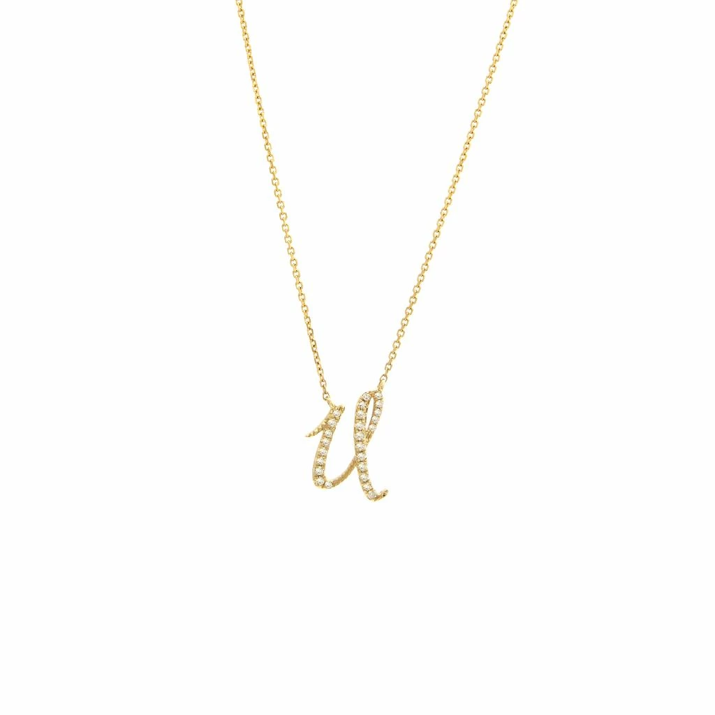 Yellow Gold Initial Single Micro Pave Diamond Necklace (14kyg Initial Necklace) (Diamond Script Initial Necklace (Yg/ 16+2″)) D – 0.11 (12.2 Mm),Promo “u”,Initial U,Letter U