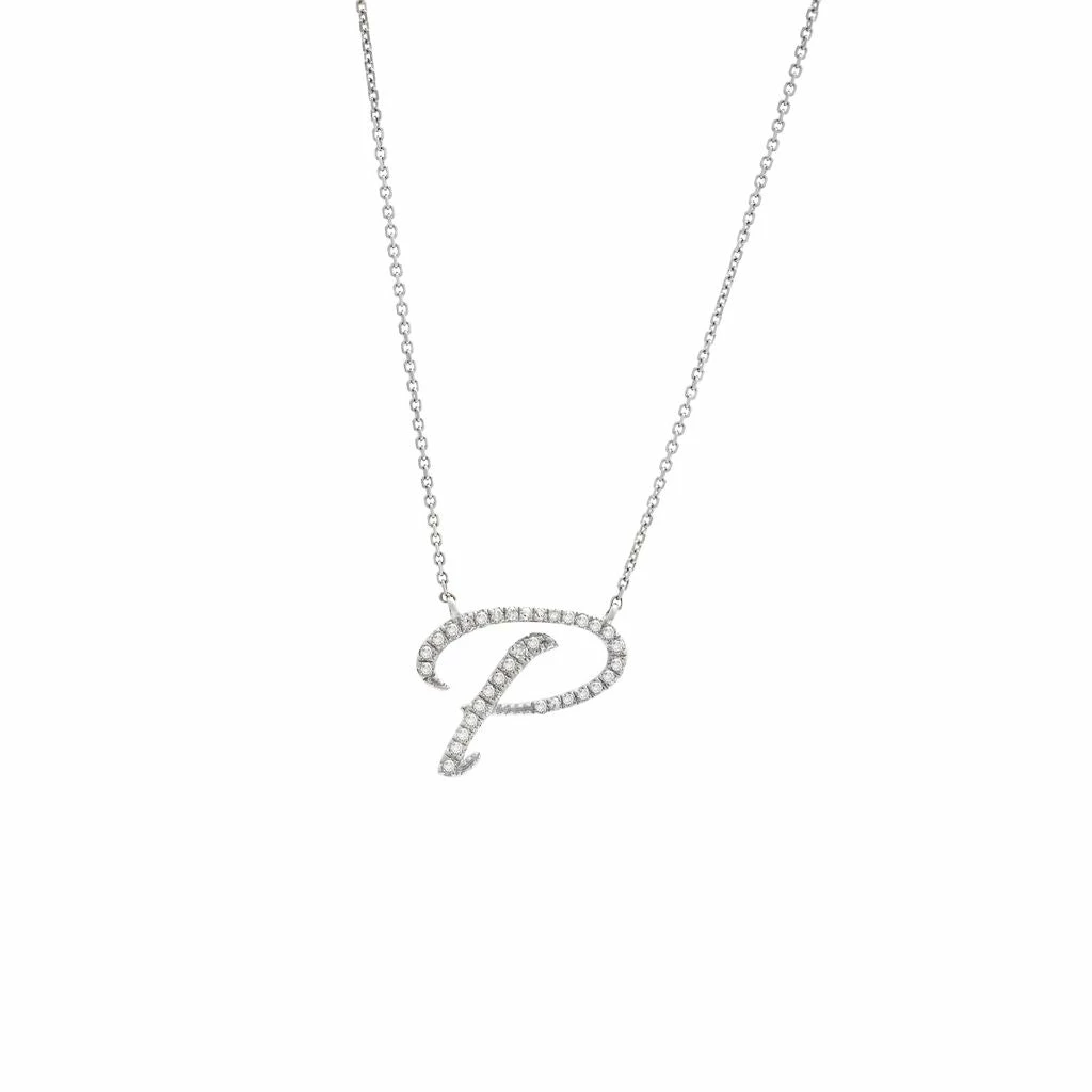 White Gold Initial Single Micro Pave Diamond Necklace (14kwg Initial Necklace) (Diamond Script Intial Necklace (Wg/ 16+2″)) D – 0.14 (14 Mm),Promo “p”,Initial P,Letter P