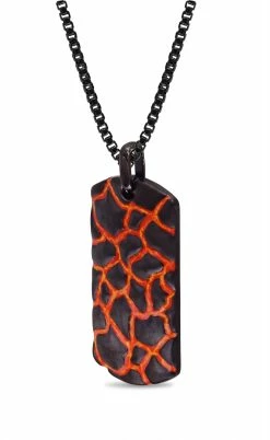 Crafted in 925 Sterling Silver, this bold tag mimics the look, feel and texture of lava flowing through molten rock. Enamel is used to create the red and orange lava aesthetic, while black rhodium is used to plate the earthy metal textures and give a dark grey glimmering finish. The chain is also plated in black rhodium.