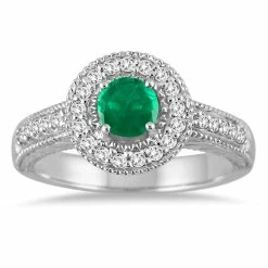 A round cut natural emerald center stone with dazzling surrounding diamonds set on a magnificent setting in white gold. 27 round diamonds weigh 0.27 carats. A round cut center all natural precious green emerald gemstone weighs 0.46 carat and measures 5mm. Top of the line detail and excellent all natural stones make this a quality ring sure to be cherished.