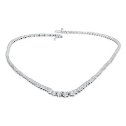 Our Graduated Tennis Necklace with 77 brilliant round diamonds graduate from small to large on this exquisite 5 carat total weight diamond tennis necklace crafted in 14K white gold. A stunning necklace great for formal occasions. All diamonds are hand selected and matched and come with a certificate of authenticity. A one of a kind diamond piece sure to be treasured and passed down for generations.
