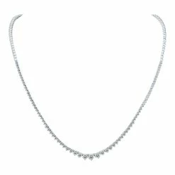 Our Graduated Tennis Necklace with 77 brilliant round diamonds graduate from small to large on this exquisite 5 carat total weight diamond tennis necklace crafted in 14K white gold. A stunning necklace great for formal occasions. All diamonds are hand selected and matched and come with a certificate of authenticity. A one of a kind diamond piece sure to be treasured and passed down for generations.