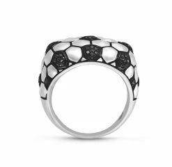 Crafted in 925 Sterling Silver, this empowering soccer ring features a soccer ball hexagonal pattern and mimics the look, feel and texture of a soccer ball. The black hexagons are studded with 1/3 carats of 100% genuine black diamonds in a pre pave setting. The black hexagons and edges between hexagons are plated in black rhodium to give a jet black, glimmering finish.