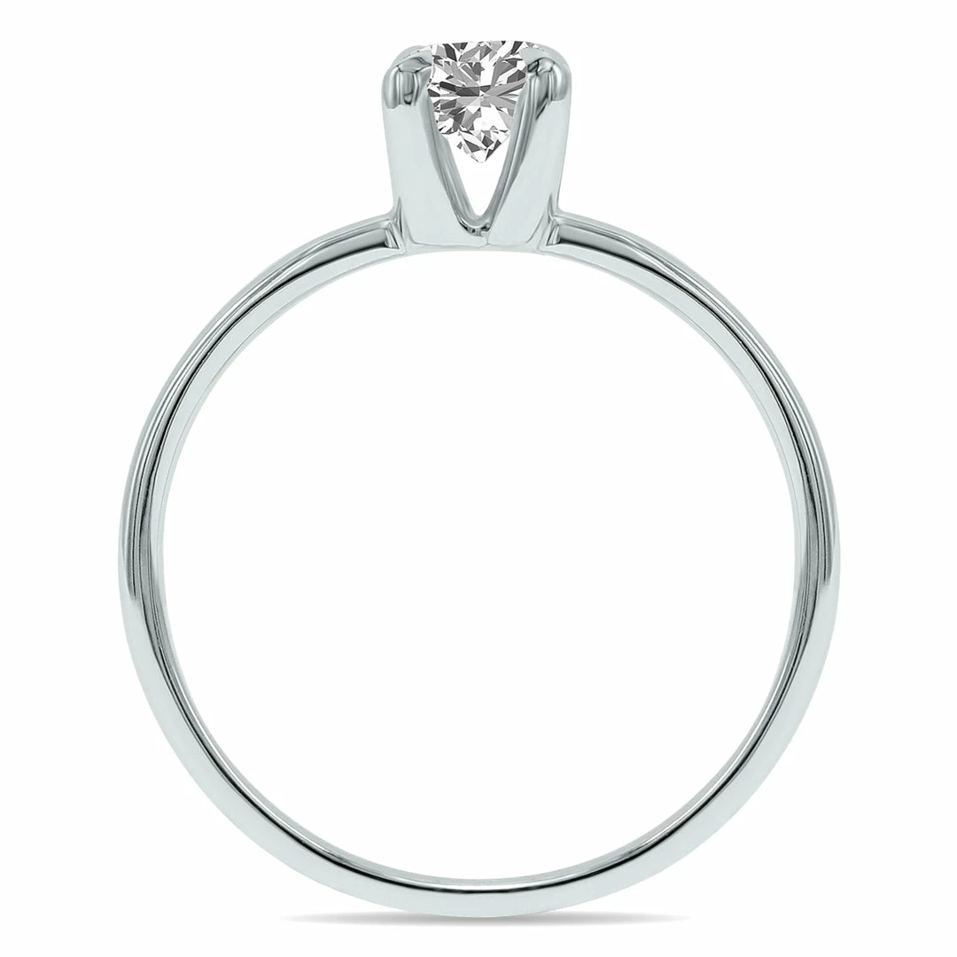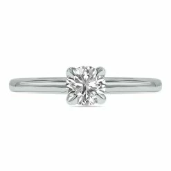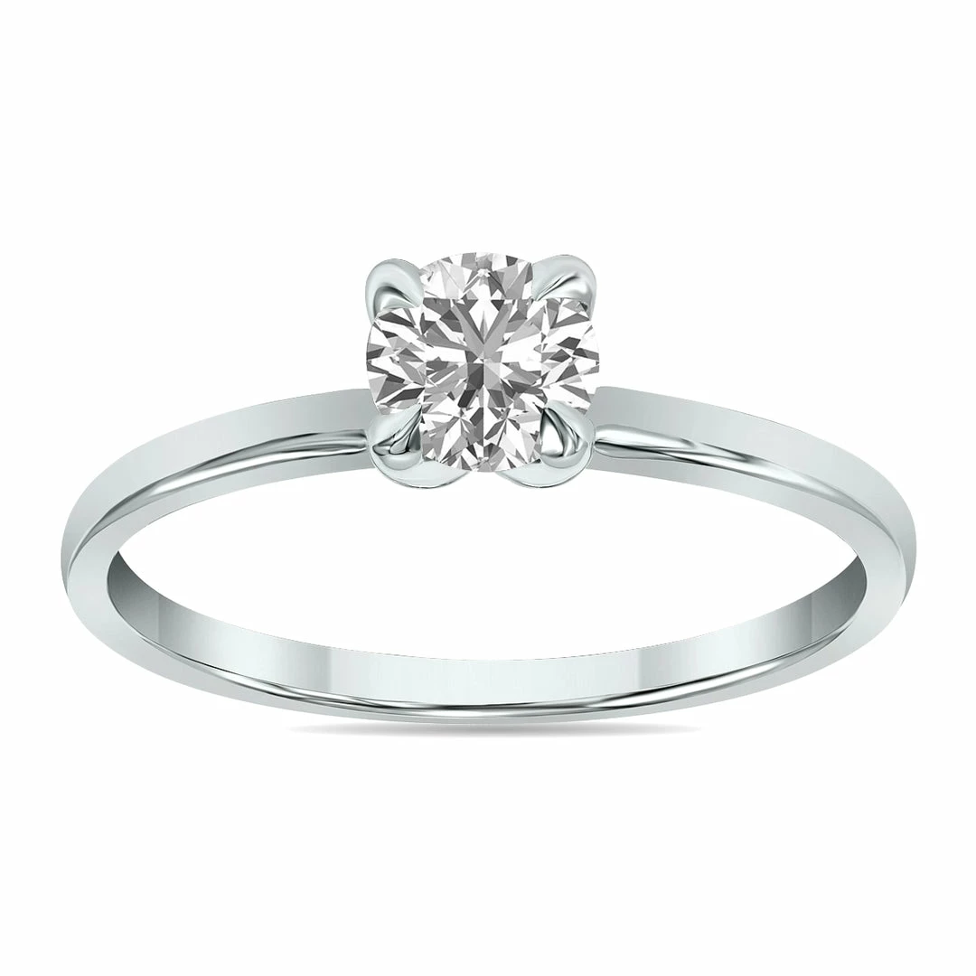 A stunning round brilliant lab grown 1/2 carat (F-G Color, VVS1-VVS2 Clarity) diamond is pristinely set on a classic solitaire ring setting crafted in 14K white gold and featuring a 4 prong head. An exceptional quality lab-grown diamond solitaire ring sure to be treasured forever. Lab diamonds consist of the same chemical and physical properties as natural diamonds, but instead of growing over thousands of years in the earth’s crust, lab diamonds are grown at warp speed in a laboratory that replicates the natural growth process within weeks instead of centuries. The result is a lab-grown diamond that shares the same optical and carbon crystal structure as a natural diamond and can usually only be distinguished from a natural diamond by using specialized testing equipment which recognizes trace elements like nitrogen. Cubic zirconia or moissanite, for example, do not share any of the chemical or physical carbon properties as a natural diamond and thus can be distinguished by the naked eye as imitation diamonds. Whether using the HPHT or CVD method when creating diamonds in a laboratory, the process is much more sustainable and environmentally conscience than the traditional mining methods of moving huge amounts of earth in search of high-grade diamonds.