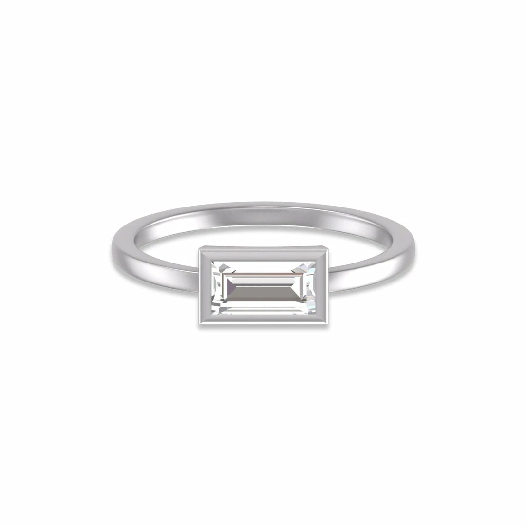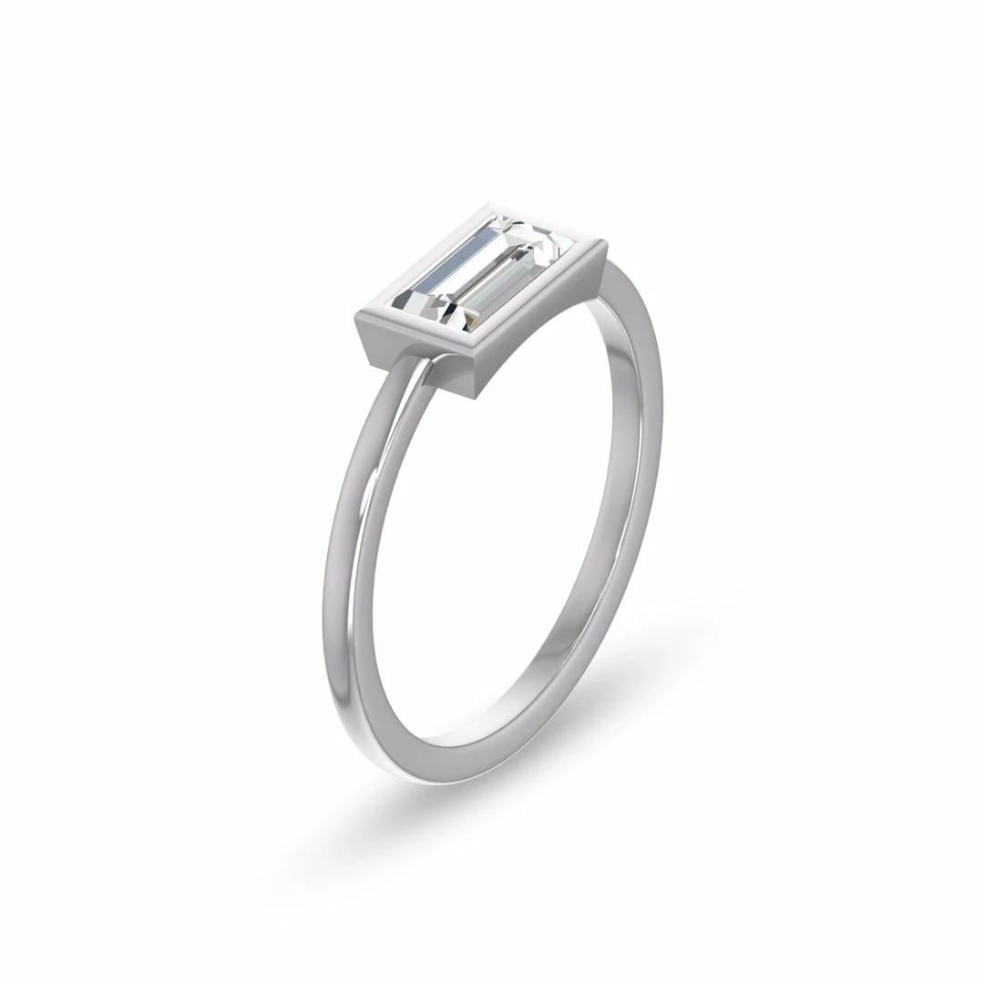 This versatile lab-grown diamond ring is the perfect everyday accessory. Expertly crafted in smooth 14K white gold, this timeless piece features a bezel set 1/2 CTW baguette-shaped diamond gracefully placed at the center of the band. There is no comparison when it comes to this ring’s smooth gold, radiant diamond, and durable setting. Whether worn alone or layered with other accessories, this environmentally conscious, sustainably made, and budget-friendly solitaire diamond ring is sure to glimmer effortlessly while elevating any outfit it is paired with.