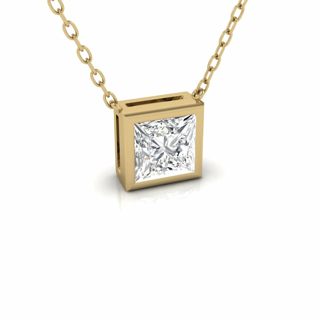This timeless lab-grown diamond necklace is an eye-catching accessory that will turn heads on any occasion. Expertly designed in 14K yellow gold, this necklace features a radiant 1/2 CTW princess-cut diamond gracefully resting on and a secure 18-inch link chain. There is no comparison when it comes to this piece’s unconditional sparkle, durable bezel setting, and masterful clean-cut lines. Whether worn alone or layered with other accessories, this environmentally conscious, sustainably made, and budget-friendly solitaire diamond necklace is sure to shine marvelously while elevating any outfit it is paired with.