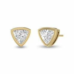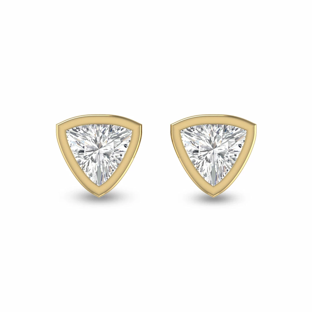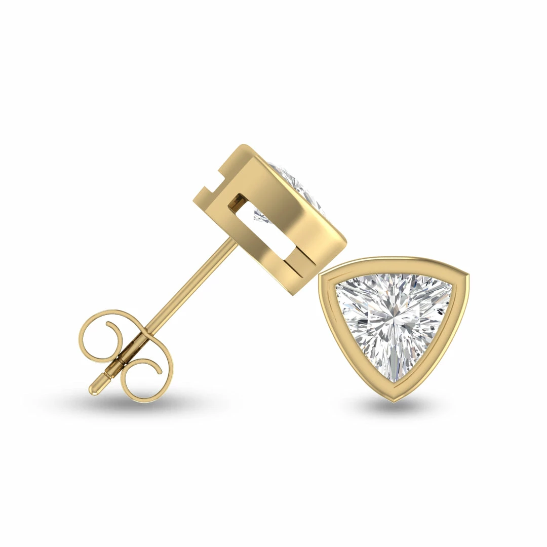 These timeless lab-grown diamond earrings are a sophisticated accessory everyone needs in their jewelry collection. Pristinely bezel set in 14K yellow gold, this radiant piece features trillion-shaped solitaire diamonds weighing 1/2 CTW and durable push-back posts. The unconditional glimmer, secure prong setting, and clean-cut lines of this piece are sure to add a subtle touch of elegance to any outfit. If you are looking for sustainably made earrings that have identical brilliance to a natural diamond while being environmentally conscious and budget-friendly, this is the accessory for you!