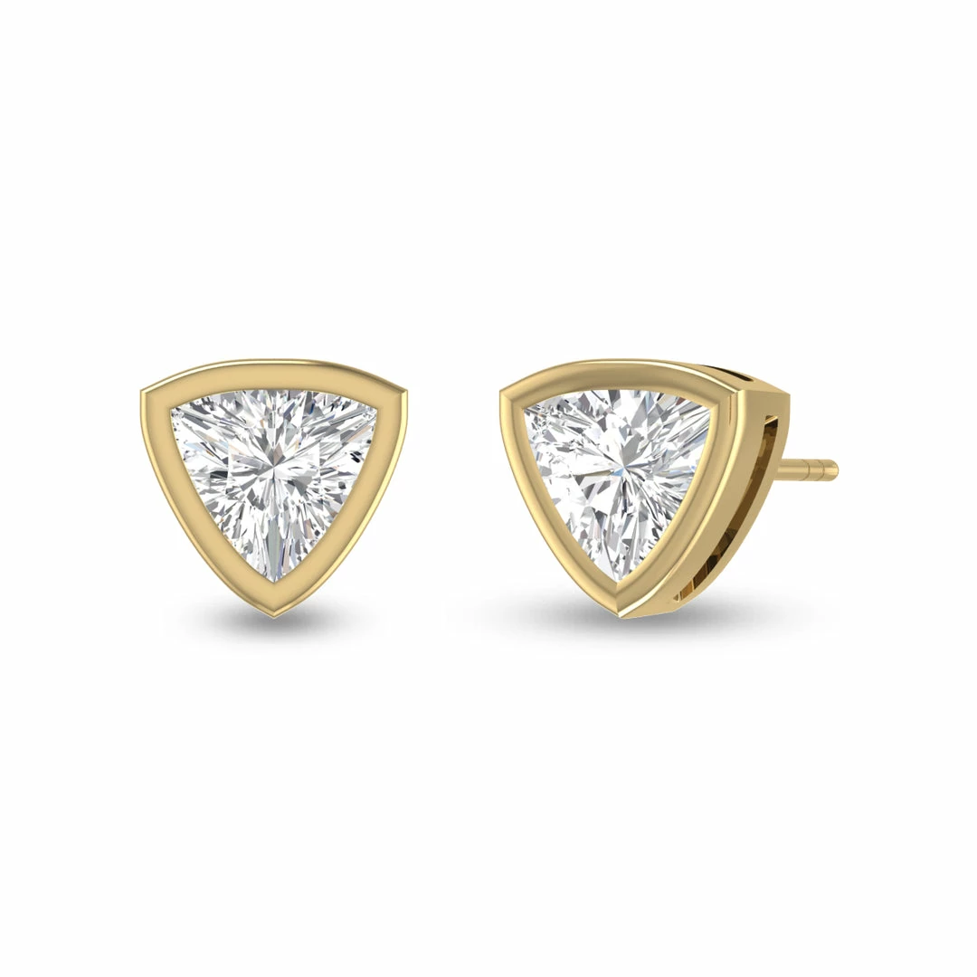 These timeless lab-grown diamond earrings are a sophisticated accessory everyone needs in their jewelry collection. Pristinely bezel set in 14K yellow gold, this radiant piece features trillion-shaped solitaire diamonds weighing 1CTW and durable push-back posts. The unconditional glimmer, secure prong setting, and clean-cut lines of this piece are sure to add a subtle touch of elegance to any outfit. If you are looking for sustainably made earrings that have identical brilliance to a natural diamond while being environmentally conscious and budget-friendly, this is the accessory for you!