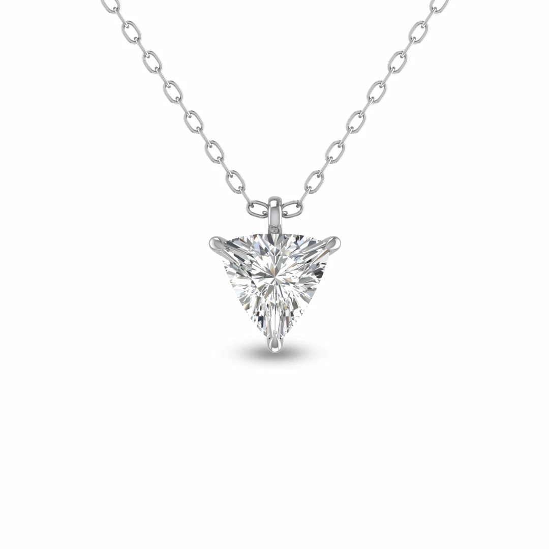 This timeless lab-grown diamond necklace is an eye-catching accessory that will turn heads on any occasion. Expertly designed in 14K white gold, this necklace features a radiant 1 CTW trillion-shaped diamond gracefully resting on and a secure 18-inch link chain. There is no comparison when it comes to this piece’s unconditional sparkle, durable prong setting, and iridescent clean-cut lines. Whether worn alone or layered with other accessories, this environmentally conscious, sustainably made, and budget-friendly solitaire diamond necklace is sure to glimmer effortlessly while elevating any outfit it is paired with.