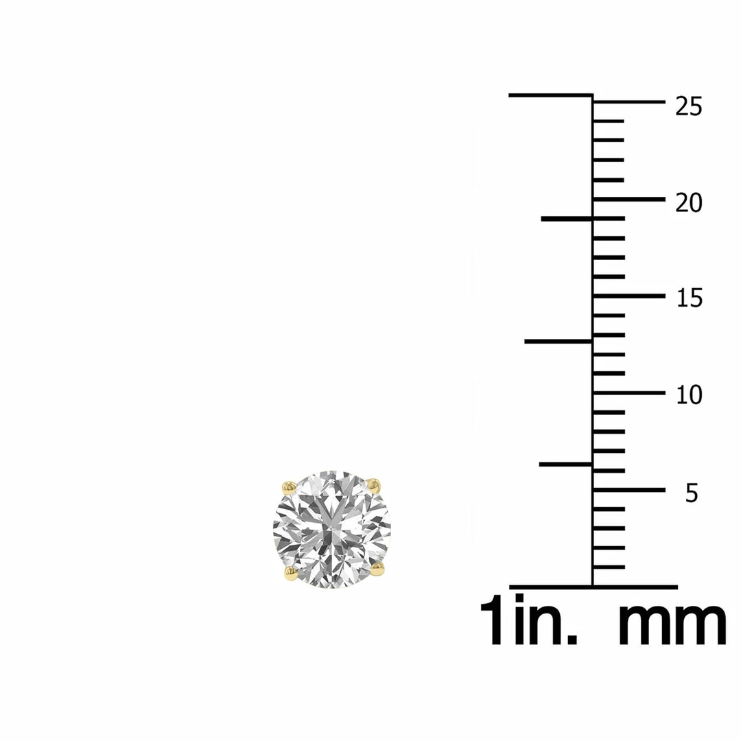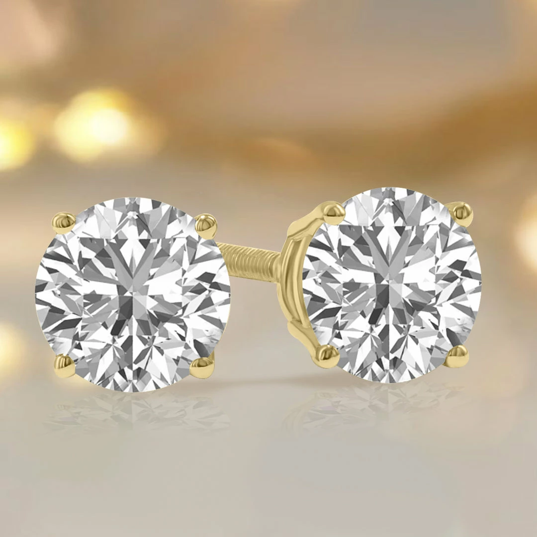A stunning pair of round brilliant lab grown 2 carat total weight (F-G Color, VVS1-VVS2 Clarity) diamonds are pristinely set on classic 4 prong basket set solitaire earrings crafted in 14K yellow gold with screw back posts. Lab diamonds consist of the same chemical and physical properties as natural diamonds, but instead of growing over thousands of years in the earth’s crust, lab diamonds are grown at warp speed in a laboratory that replicates the natural growth process within weeks instead of centuries. The result is a lab grown diamond that shares the same optical and carbon crystal structure as a natural diamond and can usually only be distinguished from a natural diamond by using specialized testing equipment which recognizes trace elements like nitrogen. Cubic zirconia or moissanite for example, do not share any of the chemical or physical carbon properties as a natural diamond and thus can be distinguished by the naked eye as an imitation diamond. Whether using the HPHT or CVD method when creating diamonds in a laboratory, the process is much more sustainable and environmentally conscience than the traditional mining methods of moving huge amounts of earth in search of high grade diamonds. An exceptional pair of lab grown diamond solitaire stud earrings sure to be treasured forever.