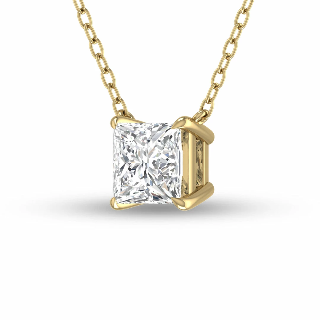This timeless lab-grown diamond necklace is an eye-catching accessory that will turn heads on any occasion. Expertly designed in 14K yellow gold, this piece features a radiant 3/4 CTW princess-cut diamond gracefully floating on and a secure 18-inch link chain. There is no comparison when it comes to this piece’s unconditional sparkle, durable prong setting, and masterful clean-cut lines. Whether worn alone or layered with other pieces, this environmentally conscious and sustainably made solitaire diamond necklace is sure to shine marvelously while elevating any outfit it is paired with.