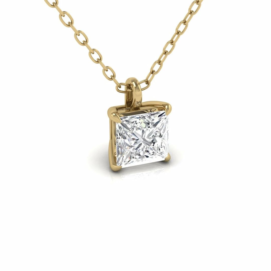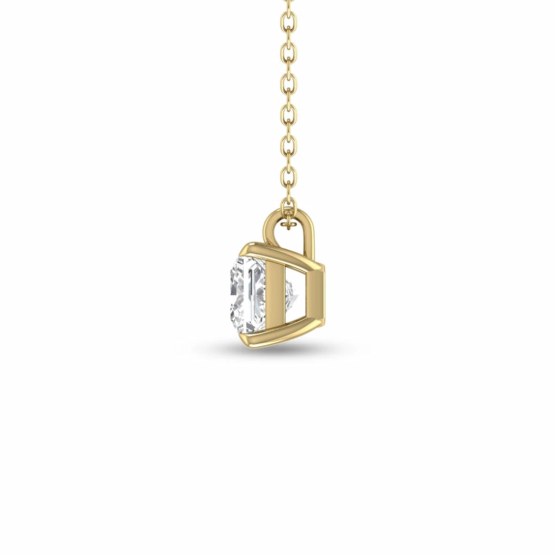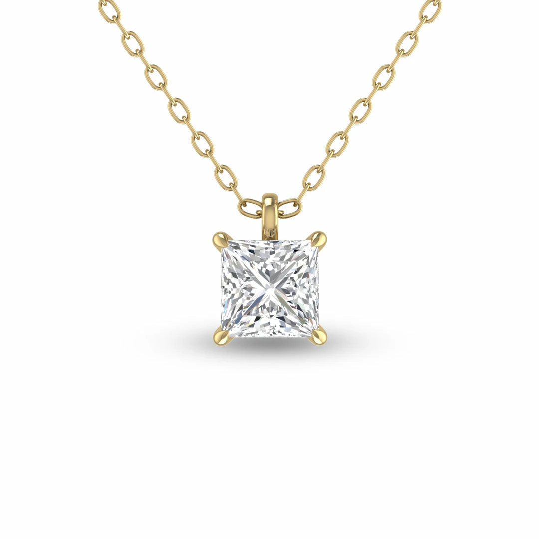 This timeless lab-grown diamond necklace is an eye-catching accessory that will turn heads on any occasion. Expertly designed in 14K yellow gold, this necklace features a radiant 3/4 CTW princess-cut diamond gracefully resting on and a secure 18-inch link chain. There is no comparison when it comes to this piece’s unconditional sparkle, durable prong setting, and iridescent clean-cut lines. Whether worn alone or layered with other accessories, this environmentally conscious, sustainably made, and budget-friendly solitaire diamond necklace is sure to glimmer effortlessly while elevating any outfit it is paired with.