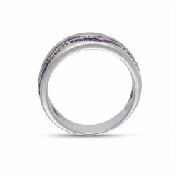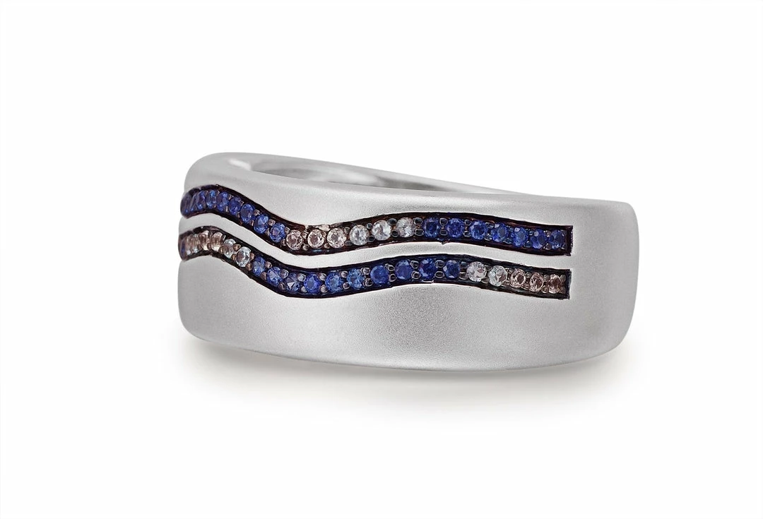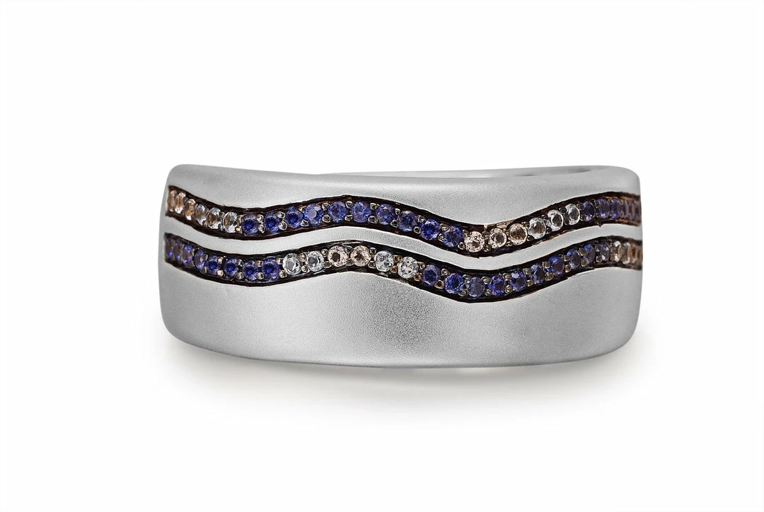 Crafted in 925 Sterling Silver, this timeless band ring features calm ocean wave motifs studded with blue sapphire, baby swiss blue topaz and white topaz stones in a pre pave setting.