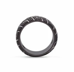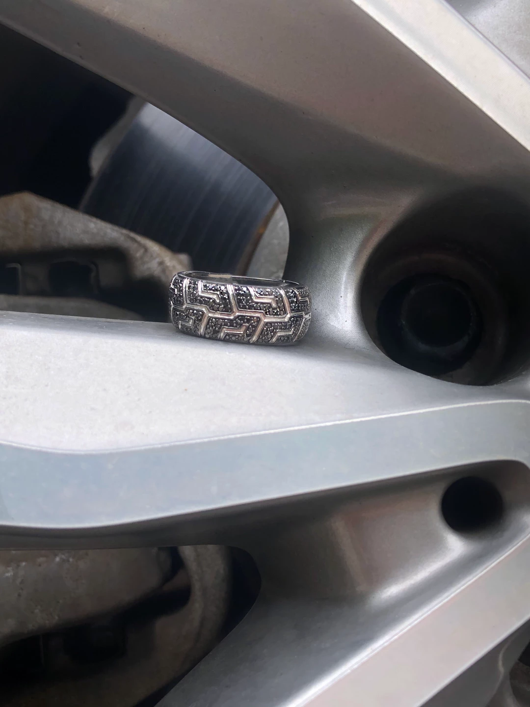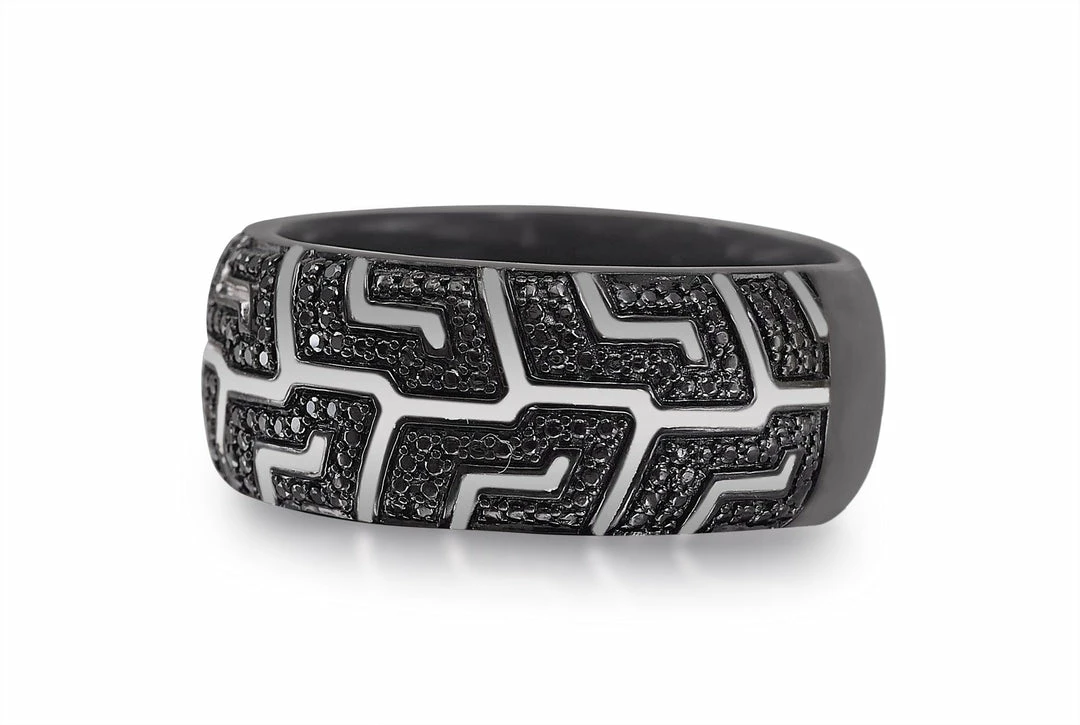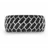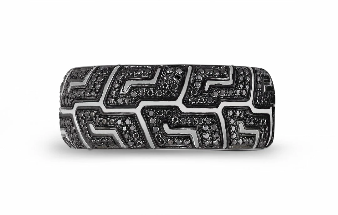 Crafted in 925 Sterling Silver, this bold band ring features a tire tread pattern studded with 100% genuine and conflict free black diamonds. This ring is plated in black rhodium to give a dark grey glimmering finish. 1/3 carats of black diamonds are used in a pre pave setting.