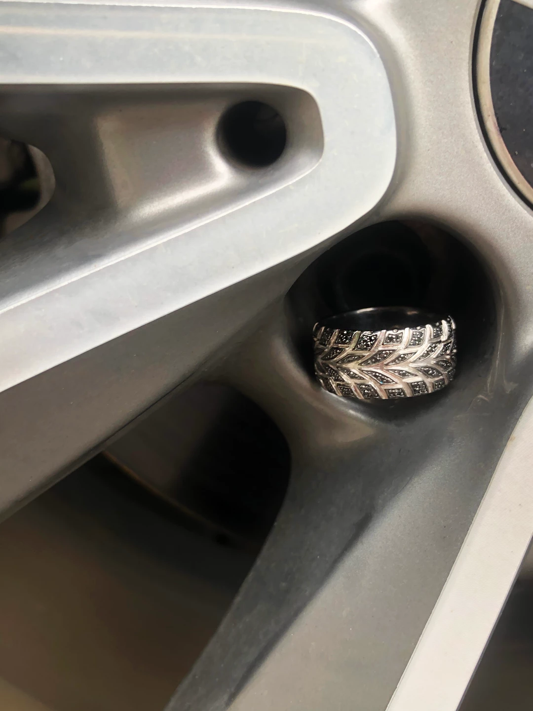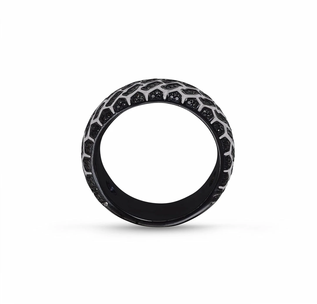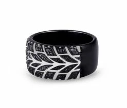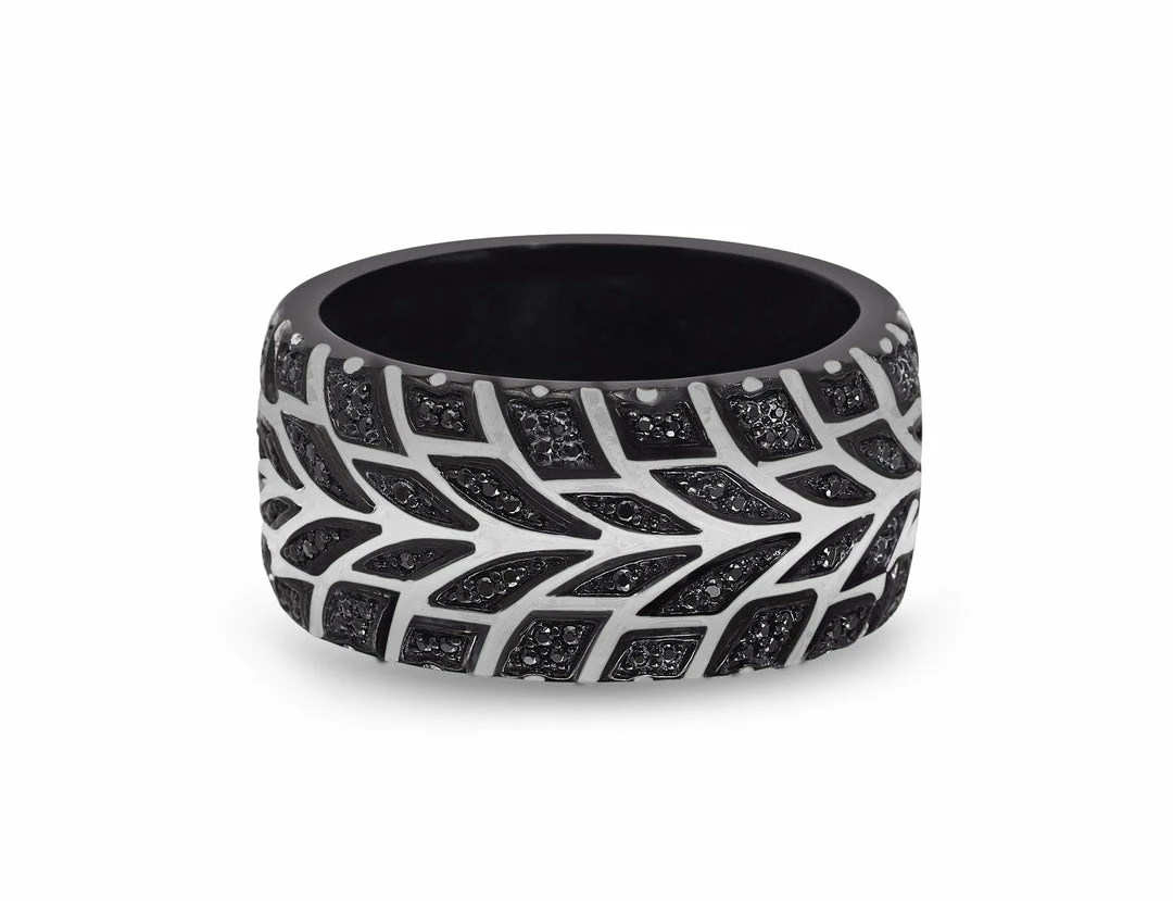 Crafted in 925 Sterling Silver, this classy and iconic ring features a tire tread pattern studded with 100% genuine and conflict free black diamonds. This ring is plated in black rhodium to give a dark grey glimmering finish. 1/4 carats of black diamonds are used in a pre pave setting.