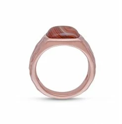 Crafted in 925 Sterling Silver, this timeless ring features a red lace agate stone with hammered precious metal texture on the ring shank. This ring is plated in 14KT Rose Gold.