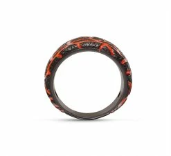 Made in 925 Sterling Silver, this elegant ring mimics the look, feel and texture of lava flowing through rugged rocky terrain. Enamel is used to create the red and orange lava aesthetic, while black rhodium is used to plate the earthy metal textures and give a dark grey glimmering finish.