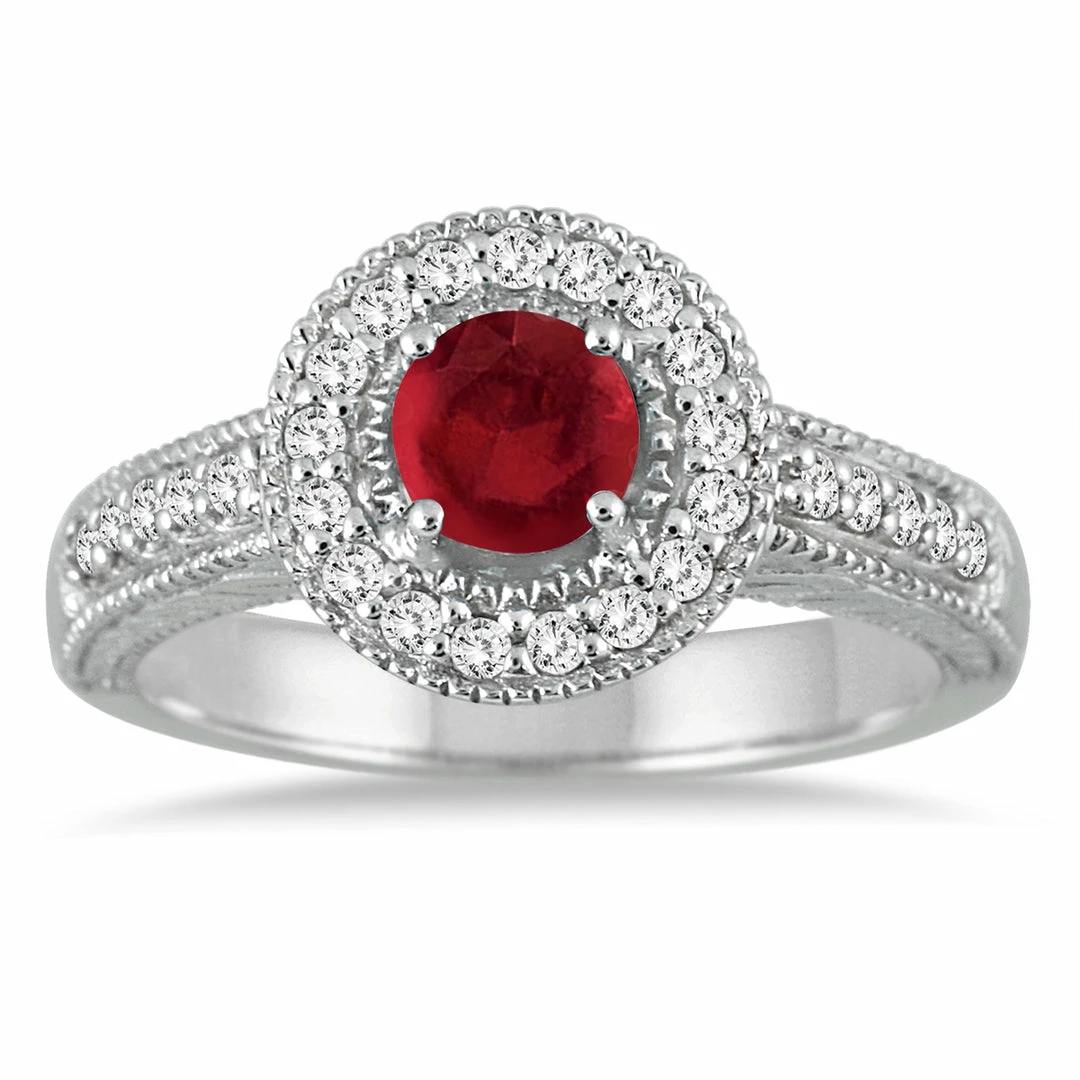 A round cut, all natural ruby center stone with dazzling surrounding diamonds set on a magnificent setting in white gold. 27 round diamonds weigh 0.27 carats. A round cut center all natural precious red ruby gemstone weighs 0.46 carat and measures 5mm. Top of the line detail and excellent all natural stones make this a quality ring sure to be cherished.