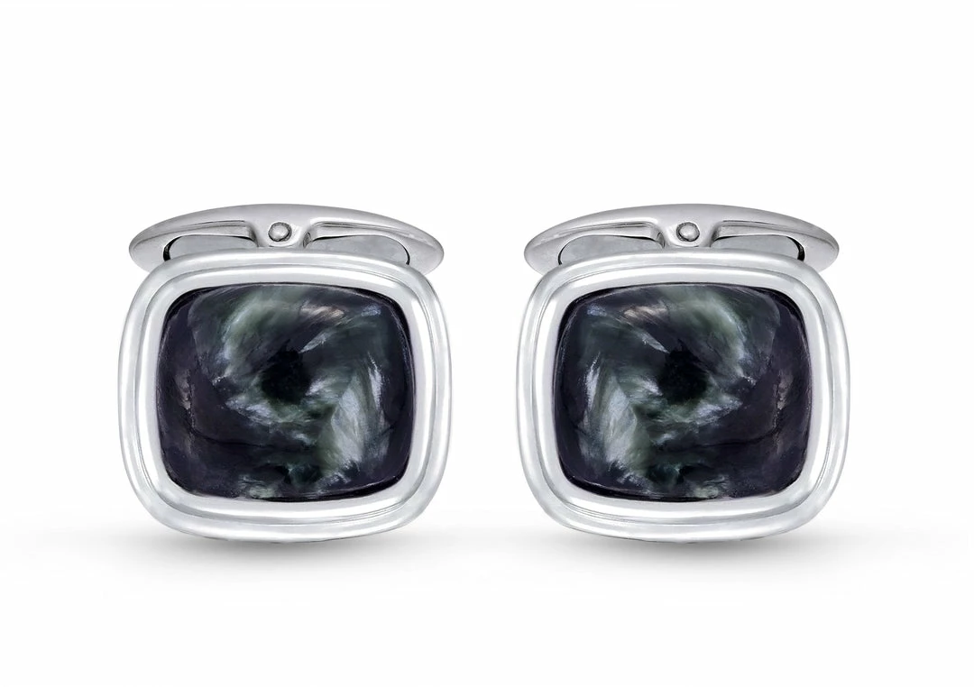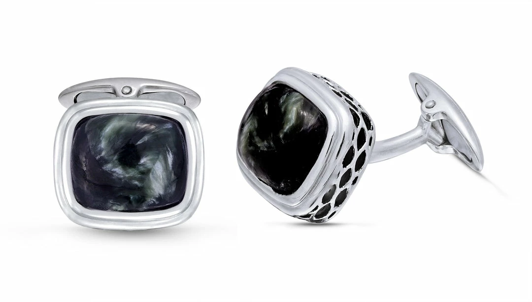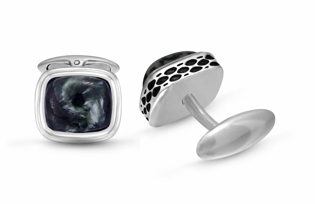 Crafted in 925 Sterling Silver, these timeless cufflinks feature Seraphinite stones with intricate honeycomb-inspired precious metal designs in Black Rhodium.