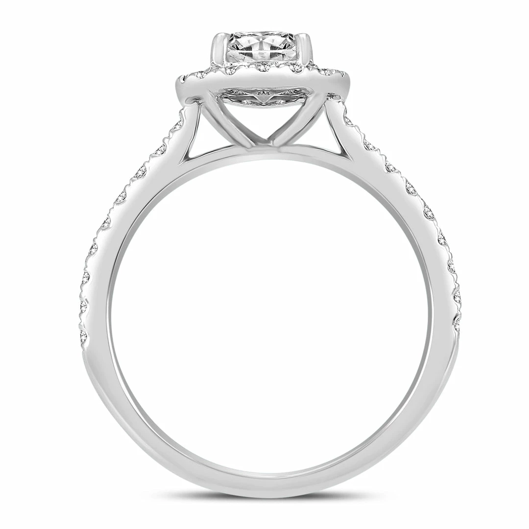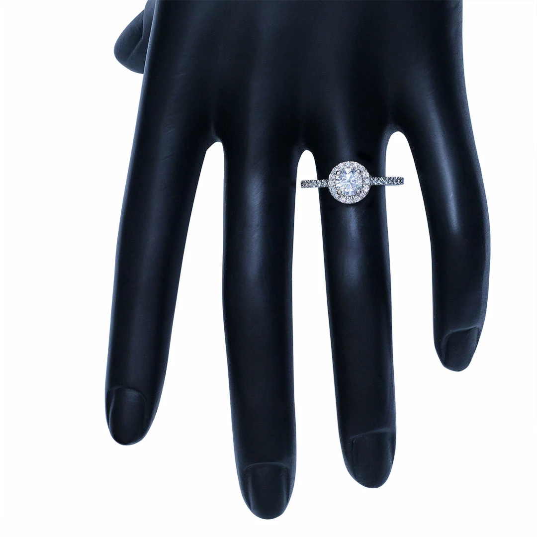 A spectacular diamond halo ring crafted in 14K white gold. A beautiful 3/4 carat center stone is prong set on a band featuring 36 sparkling white side stones. Side stones weigh 1/4 carats in total. A big brilliant look 1 carat total weight diamond halo engagement, Diamonds are hand matched and set by experienced jewelers and feature top of the line setting workmanship and finishing.