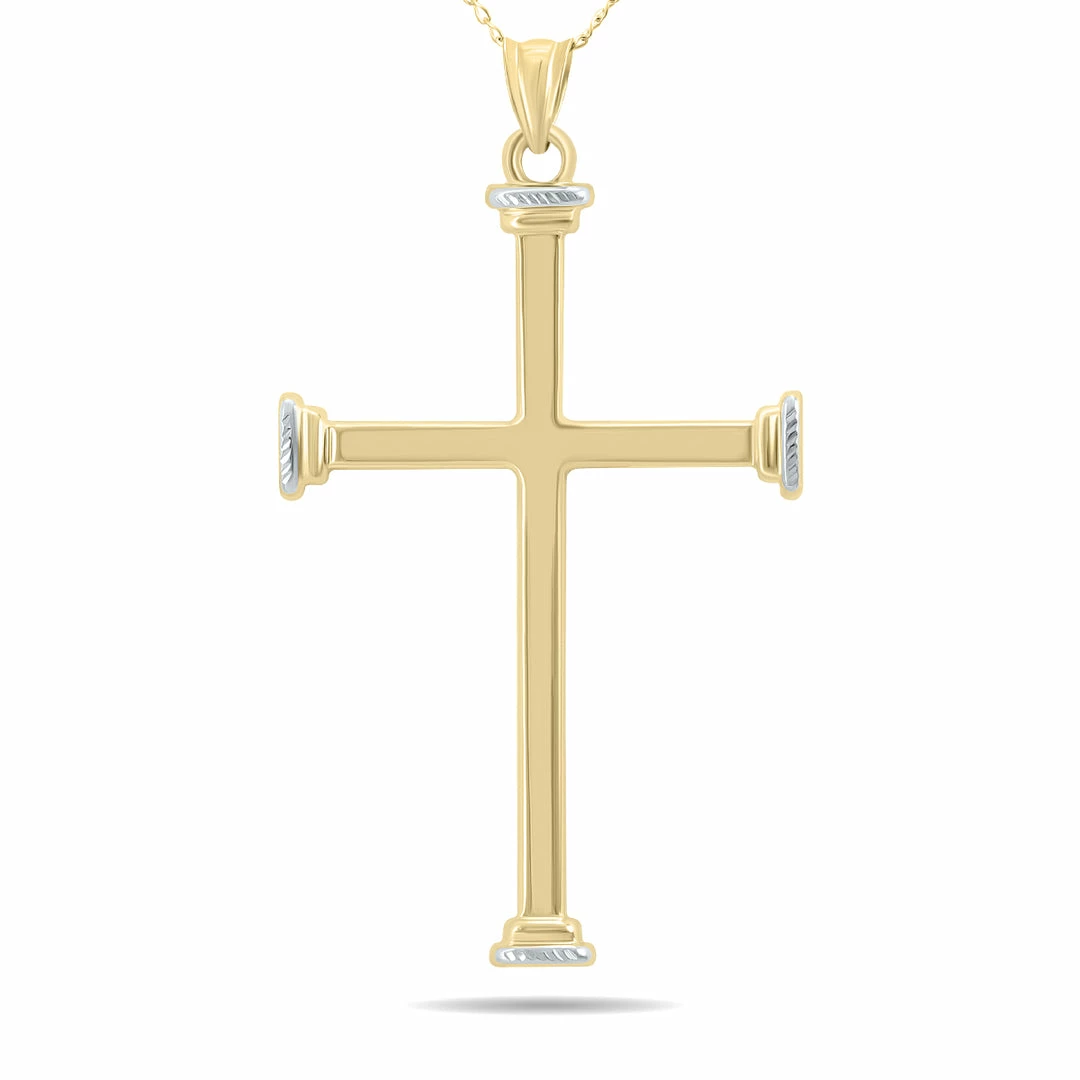 A precious symbol of you faith and devotion. This bold cross pendant is crafted in 10K gold and radiates a divine brilliance that is unmatched by any other design. The cross pendant measures 46x36mm and hangs from an 18 inch chain also crafted in 10K gold. The chain secures with a standard spring ring clasp. The pendant is designed and finished with the highest attention to craftsmanship and detail. A beautiful religious faith pendant necklace perfect for everyday wear.