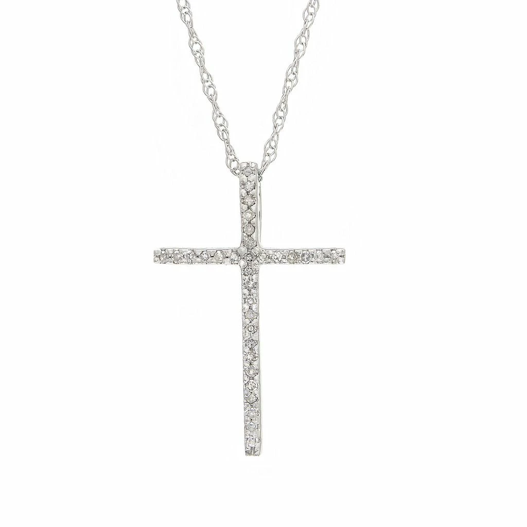 White Gold Cross Single Prong Diamond Pendant (14kwg Cross Pendant) (Small Prong Cross Necklace (Wg)) D – 0.15 (21.05mm H),D-0.15,Cross,Religious
