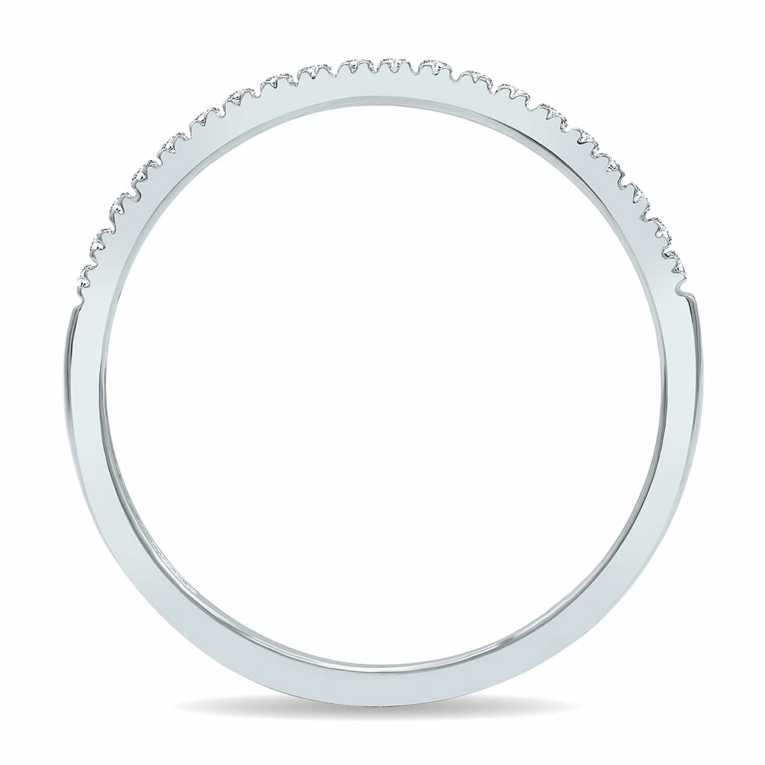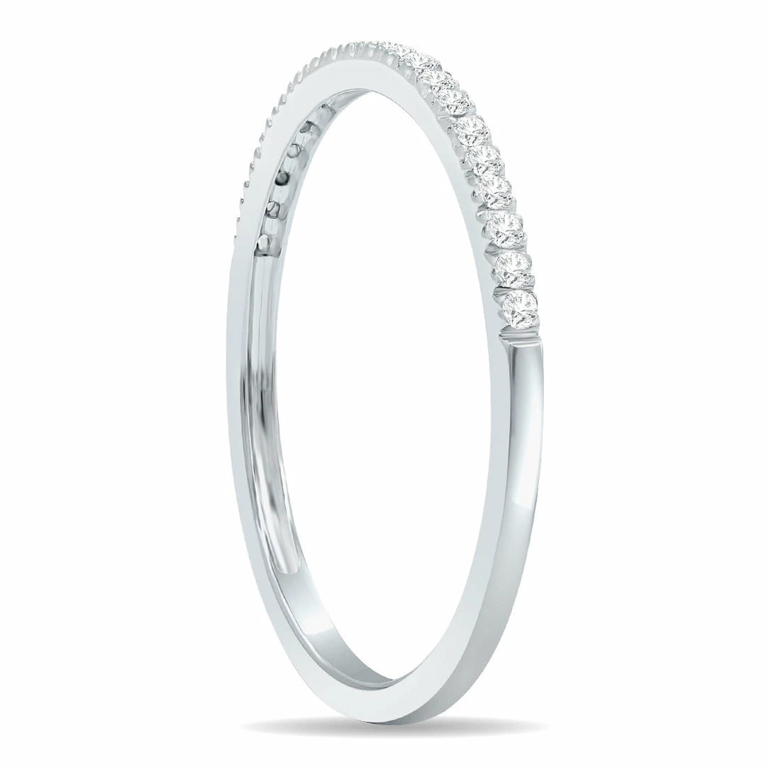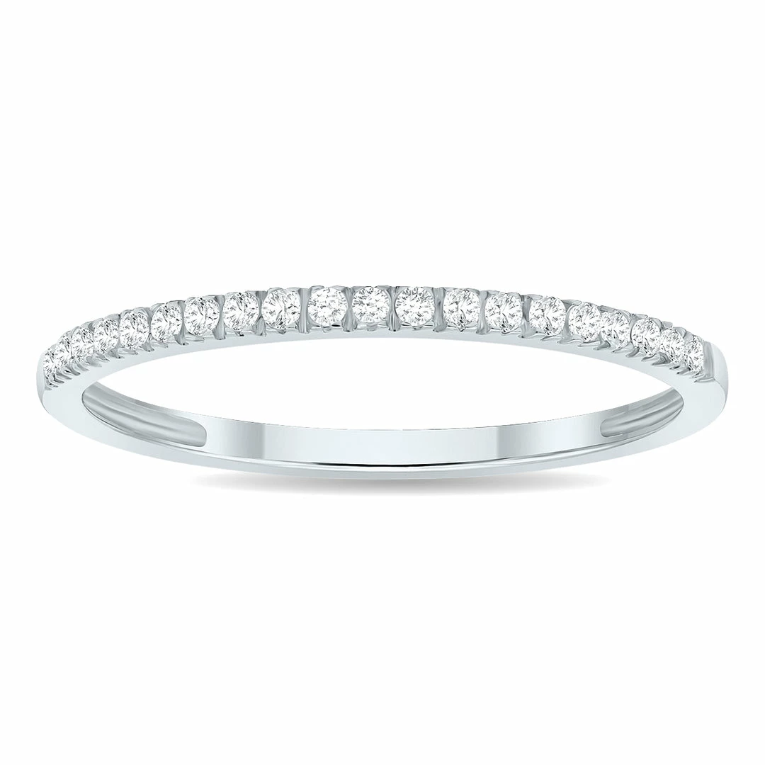A simple, thin lightweight diamond band crafted in 10K white gold. The diamond band features 20 round prong set white diamonds weighing 1/6 carat total weight. A beautiful band that can be worn as wedding band, a fashion diamond band or as a stackable ring. The diamonds are hand selected, matched and set by experienced jewelers with the highest attention to quality and finishing details. A perfect diamond band sure to be treasured forever. The band measures 1mm in width.